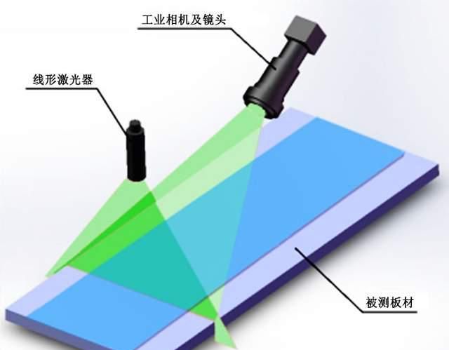 另外还有一种基于机器视觉的测量仪,激光器发出的激光照射在复合板的板面上,且激光的方向与复合板的宽度方向平行。工业相机在复合板上方倾斜一定的角度对准激光带拍摄图像,工业相机拍摄的图像通过数据线传输到工控机进行计算,通过计算可以得到如下尺寸数据(以铜铝复合板为例):(1)下层铝板的宽度;(2)上层铜板的宽度;(3)铝板左边外露尺寸;(4)铝板右边外露尺寸。通过对尺寸铝板左右两边外露尺寸的对比即可得到复合板的对称度。既可检测宽度又可检测对称度。